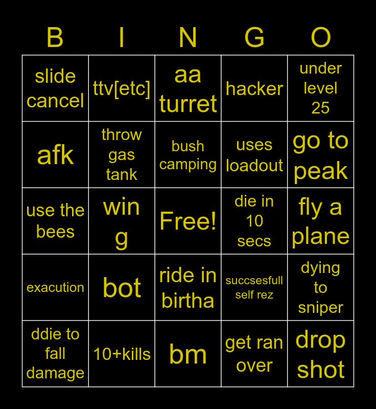 This bingo card has a free space and 24 words: bot, 10+kills, bush camping, ddie to fall damage, under level 25, slide cancel, afk, ttv[etc], die in 10 secs, ride in birtha, uses loadout, use the bees, succsesfull self rez, dying to sniper, throw gas tank, get ran over, fly a plane, aa turret, go to peak, win g, drop shot, exacution, hacker and bm.