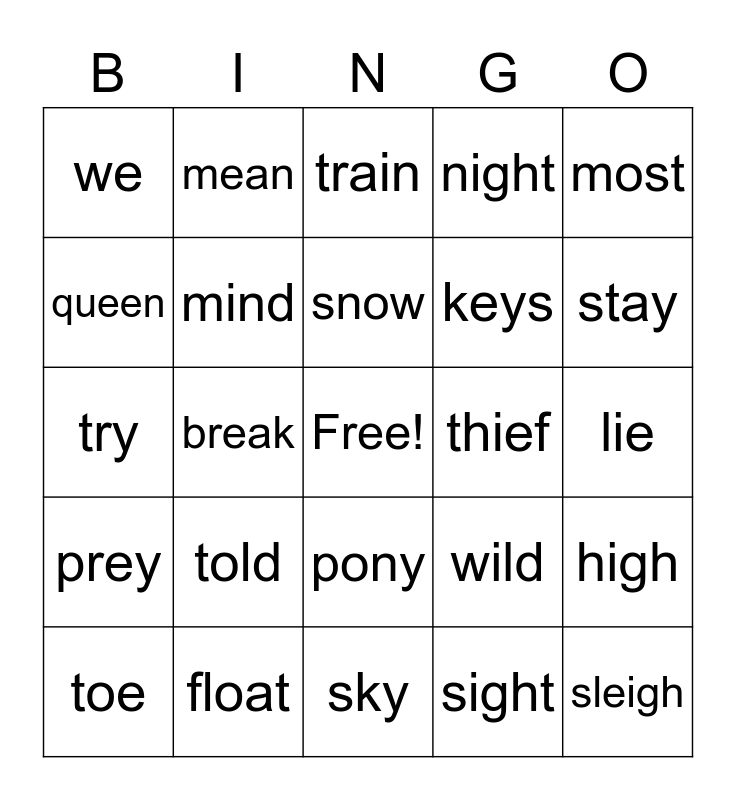 This bingo card has a free space and 24 words: told, float, snow, toe, most, we, queen, mean, thief, pony, keys, try, wild, high, mind, sight, lie, train, stay, break, sleigh, prey, night and sky.