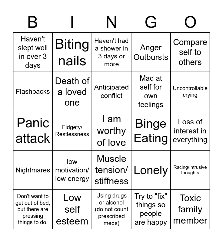 This bingo card has a free space and 29 words: Don't want to get out of bed, but there are pressing things to do., Financial stress, Fidgety/ Restlessness, Negative thoughts about self, Haven't slept well in over 3 days, Haven't had a shower in 3 days or more, Death of a loved one, low motivation/ low energy, Binge Eating, Low self esteem, Loss of interest in everything, Toxic family member, Using drugs or alcohol (do not count prescribed meds), Try to "fix" things so people are happy, Uncontrollable crying, Problems at work, Muscle tension/ stiffness, Nightmares, Compare self to others, Panic attack, Lonely, Thoughts of hurting myself or someone else, Mad at self for own feelings, Flashbacks, Anger Outbursts, Biting nails, Racing/Intrusive thoughts, Anticipated conflict and Overwhelmed by daily life.