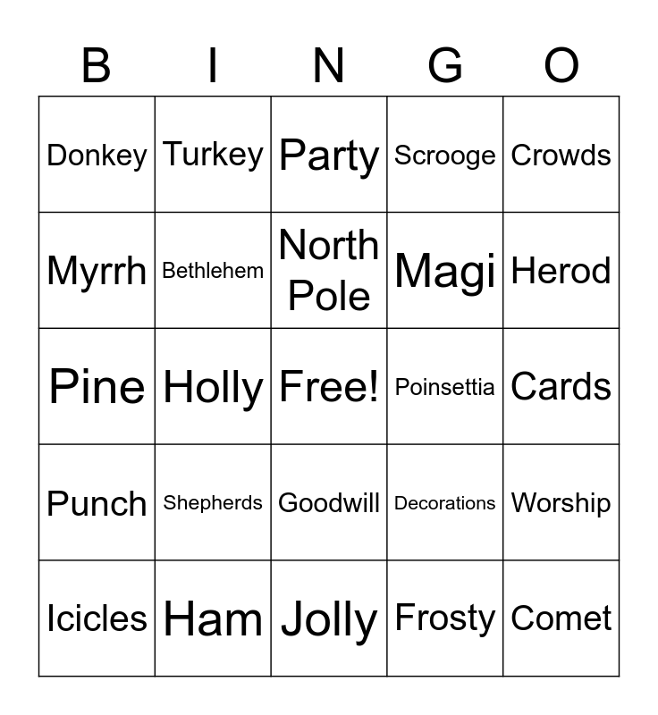 This bingo card has a free space and 253 words: Advent, Angels, Announcement, Bells, Bethlehem, Blitzen, Candles, Candy, Candy canes, Cards, Cedar, Celebrate, Ceremonies, Chimney, Christmas cookies, Christmas tree, Cold, Comet, Cranberry sauce, Crowds, Cupid, Dancer, Dasher, December, Decorations, Dolls, Donner, Dressing, Eggnog, Elves, Family reunion, Festival, Fir, Frosty, Fruitcake, Gift boxes, Gifts, Goodwill, Greetings, Ham, Happy, Holiday, Holly, Holy, Icicles, Jolly, Lights, Lists, Merry, Miracle, Mistletoe, New Year, Noel, North Pole, Pageant, Parades, Party, Pie, Pine, Plum pudding, Poinsettia, Prancer, Presents, Pumpkin pie, Punch, Red/green, Reindeer, Ribbon, Rudolph, Sacred, Sales, Sauce, Scrooge, Season, Sled, Sleighbells, Snowflakes, Spirit, St. Nick, Stand, Star, Stickers, Stocking stuffers, Sweet potato, Tidings, Tinsel, Togetherness, Toys, Tradition, Traffic, Trips, Turkey, Vacation, Vixen, Winter, Worship, Wrapping paper, Wreath, Jesus, Manger, Wise Men, Shepherds, Mary, Joseph, Child, Herod, Egypt, Bethlehem, Magi, Gold, Frankensense, Myrrh, Carols, Church, Immanuel, Yule, Yuletide, Prophesy, Salvation, Carpenter, Worship, King, David, Judah, Advent, Angels, Announcement, Bells, Bethlehem, Blitzen, Candles, Candy, Candy canes, Cards, Cedar, Celebrate, Ceremonies, Chimney, Christmas cookies, Christmas tree, Cold, Comet, Cranberry sauce, Crowds, Cupid, Dancer, Dasher, December, Decorations, Dolls, Donner, Dressing, Eggnog, Elves, Family reunion, Festival, Fir, Frosty, Fruitcake, Gift boxes, Gifts, Goodwill, Greetings, Ham, Happy, Holiday, Holly, Holy, Icicles, Jolly, Lights, Lists, Merry, Miracle, Mistletoe, New Year, Noel, North Pole, Pageant, Parades, Party, Pie, Pine, Plum pudding, Poinsettia, Prancer, Presents, Pumpkin pie, Punch, Red/green, Reindeer, Ribbon, Rudolph, Sacred, Sales, Sauce, Scrooge, Season, Sled, Sleigh bells, Snowflakes, Spirit, St. Nick, Stand, Star, Stickers, Stocking stuffers, Sweet potato, Tidings, Tinsel, Togetherness, Toys, Tradition, Traffic, Trips, Turkey, Vacation, Vixen, Winter, Worship, Wrapping paper, Wreath, Jesus, Manger, Wise Men, Shepherds, Mary, Joseph, Child, Herod, Egypt, Magi, Gold, Frankensense, Myrrh, Carols, Church, Immanuel, Yule, Yuletide, Prophesy, Salvation, Carpenter, Worship, King, David, Judah, Donkey, Giving, Ornaments, Fog, Incarnation and Silent Night.