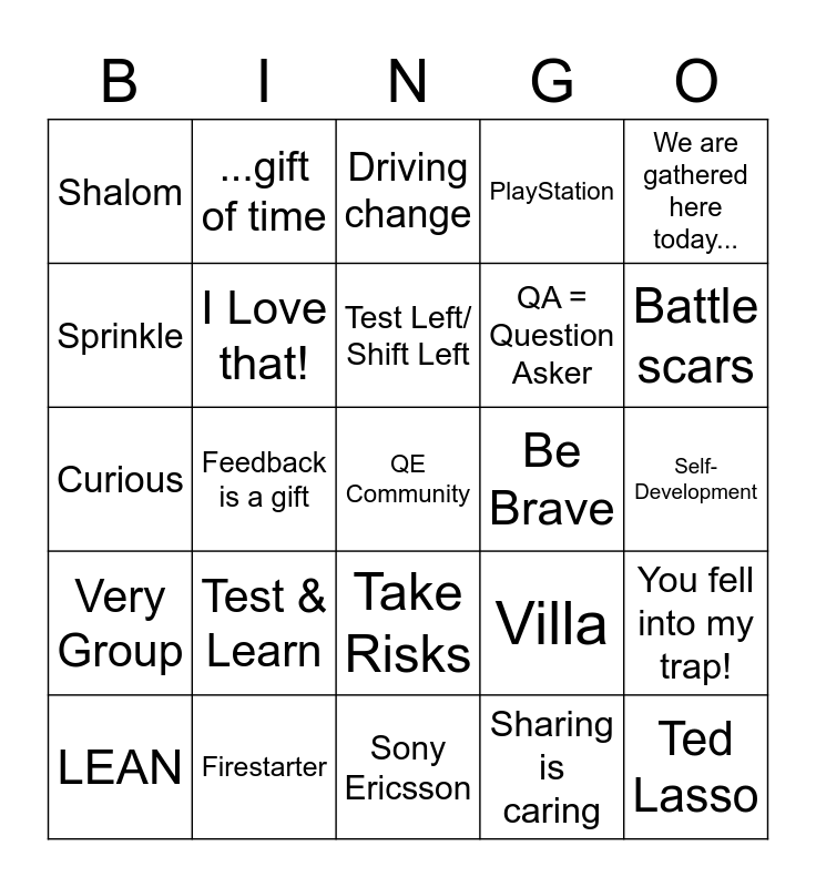 This bingo card has a free space and 24 words: Test & Learn, Firestarter, Test Left/ Shift Left, LEAN, We are gathered here today..., Shalom, Sprinkle, ...gift of time, Be Brave, Take Risks, QA = Question Asker, Curious, Villa, You fell into my trap!, I Love that!, Sharing is caring, Self-Development, Driving change, Battle scars, Feedback is a gift, Ted Lasso, Very Group, PlayStation and Sony Ericsson.