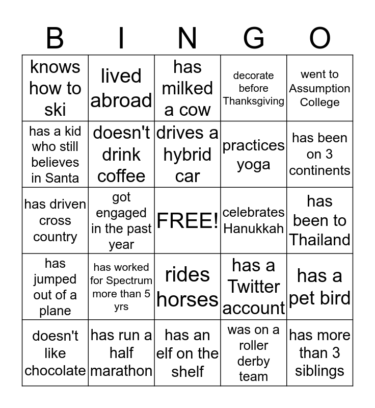 This bingo card has a free space and 24 words: has worked for Spectrum more than 5 yrs, has run a half marathon, drives a hybrid car, doesn't like chocolate, went to Assumption College, knows how to ski, has a kid who still believes in Santa, lived abroad, celebrates Hanukkah, rides horses, practices yoga, has driven cross country, has a Twitter account, has a pet bird, doesn't drink coffee, was on a roller derby team, has been to Thailand, has milked a cow, has been on 3 continents, got engaged in the past year, has more than 3 siblings, has jumped out of a plane, decorate before Thanksgiving and has an elf on the shelf.