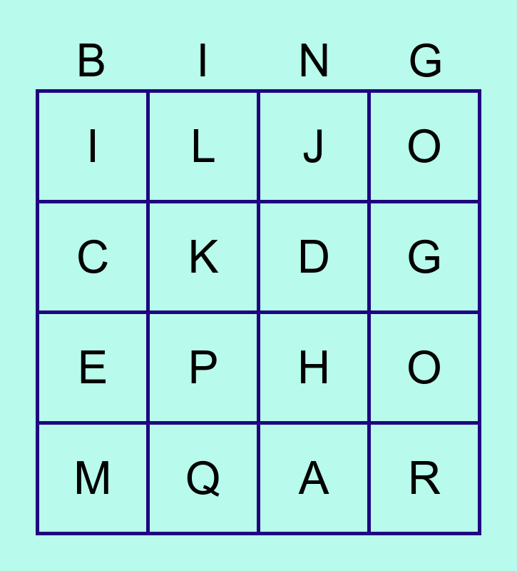 This bingo card has 19 words: H, N, J, R, O, C, A, I, L, E, P, K, D, Q, M, F, O, G and M.