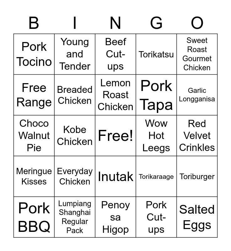 This bingo card has a free space and 51 words: Fresh Eggs, Salted Eggs, Balut, Penoy sa Higop, Everyday Chicken, Premium, Young and Tender, Family Feast per, Free Range, Chicken Cut-ups, Breaded Chicken, Torikatsu, Toriburger, Torikaraage, Marinated Chicken, Spicy Neck 500g/pk, Lemon Roast Chicken, Wow Hot Leegs, Spicy Gourmet Chicken, Sweet Roast Gourmet Chicken, Kobe Chicken, Pork Cut-ups, Pork Tocino, Pork Tapa, Pork Teriyaki, Chicharon Bulaklak, Garlic Longganisa, Chorizo De Cebu, Pork BBQ, Beef Cut-ups, Seafoods, Pepper Beef Regular Pack, Samgyupsal Regular Pack, Krispy Kare-Kare Regular Pack, Smoky BBQ Liempo Regular Pack, Lumpiang Shanghai Regular Pack, Beef Tapa Regular Pack, Classic Pork Sisig Regular Pack, Bacon Bagnet, Chocolate Crinkles jar, Red Velvet Crinkles, Meringue Kisses, Garlic Peanuts, Spicy Peanut, Sweet Coated Peanuts, Ensaymada, Choco Walnut Pie, Cheese Pie, Butter Stick, Inutak and Sumax.