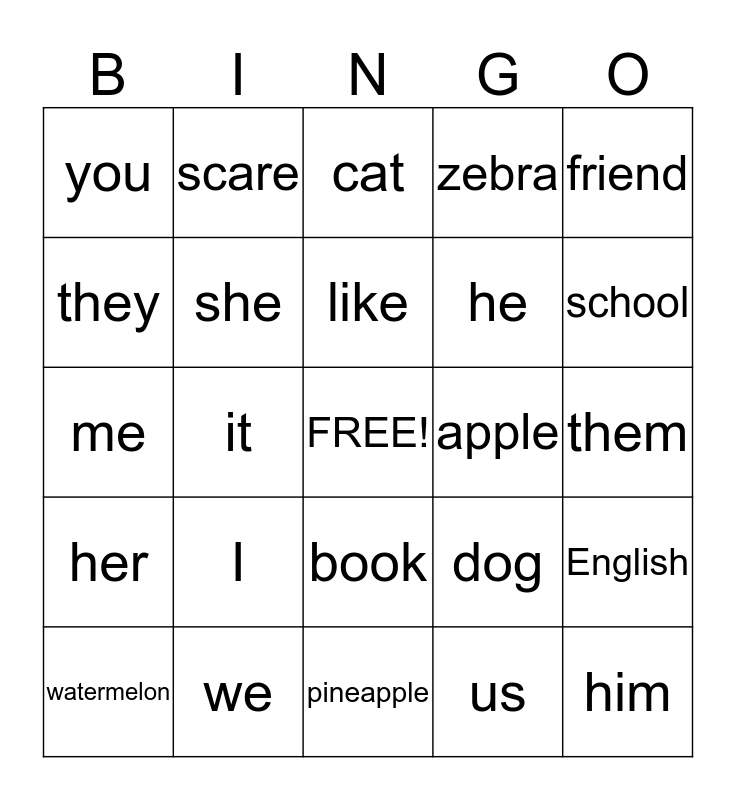 This bingo card has a free space and 24 words: I, we, like, watermelon, friend, you, they, scare, apple, book, he, me, dog, English, she, us, them, cat, school, it, him, her, zebra and pineapple.