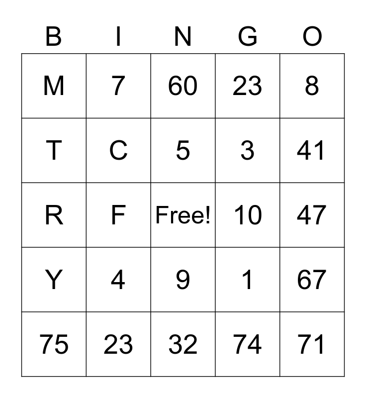 This bingo card has a free space and 24 words: 4, 23, 5, 75, 8, M, T, 7, 10, 9, 3, R, 1, 67, C, 74, 47, 60, 41, F, 71, Y, 23 and 32.
