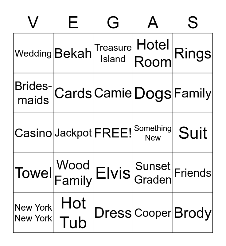 This bingo card has a free space and 24 words: Wood Family, Hot Tub, Camie, New York New York, Rings, Wedding, Brides-maids, Bekah, Something New, Elvis, Dogs, Casino, Sunset Graden, Friends, Cards, Cooper, Suit, Treasure Island, Family, Jackpot, Brody, Towel, Hotel Room and Dress.