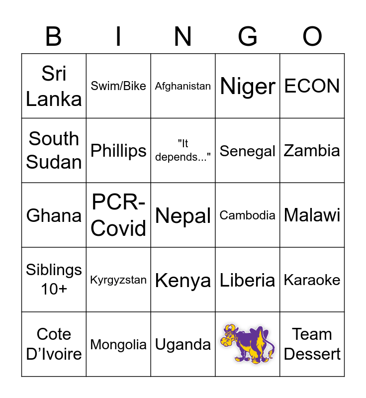 This bingo card has 1 images and 31 words: GDP, PCR-Covid, Coffee, Siblings 10+, Phillips, ECON, Karaoke, Swim/Bike, Team Dessert, "It depends...", Afghanistan, Angola, Bangladesh, Cambodia, Cameroon, Cote D’Ivoire, Ghana, Kenya, Kyrgyzstan, Liberia, Madagascar, Malawi, Mongolia, Nepal, Niger, Senegal, South Sudan, Sri Lanka, Uganda, Vietnam and Zambia.