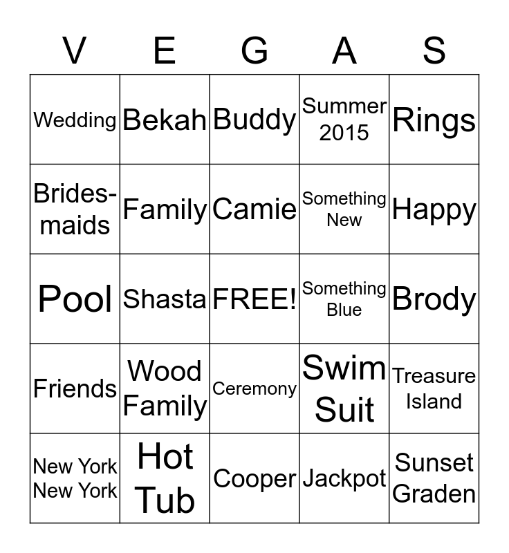 This bingo card has a free space and 24 words: Wood Family, Hot Tub, Camie, New York New York, Rings, Wedding, Brides-maids, Bekah, Something Blue, Ceremony, Something New, Pool, Swim Suit, Treasure Island, Family, Jackpot, Brody, Buddy, Happy, Shasta, Sunset Graden, Friends, Summer 2015 and Cooper.