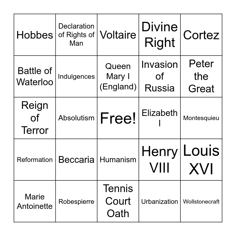 This bingo card has a free space and 36 words: Renaissance, Martin Luther, 95 Theses, Indulgences, Henry VIII, Reformation, Queen Mary I (England), Columbian Exchange, Cortez, Pizarro, Absolutism, Divine Right, Louis XIV, Elizabeth I, Peter the Great, Hobbes, Locke, Beccaria, Wollstonecraft, Voltaire, Montesquieu, Louis XVI, Robespierre, Marie Antoinette, Tennis Court Oath, Declaration of Rights of Man, Reign of Terror, Continental System, Invasion of Russia, Battle of Waterloo, Congress of Vienna, Napoleon, Urbanization, Humanism, Industrialization and Enlightenment.