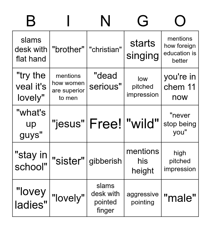 This bingo card has a free space and 32 words: aggressive pointing, "female", "jesus", slams desk with fist, "stay in school", mentions how women are superior to men, mentions how foreign education is better, high pitched impression, "brother", mentions religion, "dead serious", "christian", draws a face, this is chem 11, "wild", "don't do drugs kids", "lovey ladies", "what's up guys", gibberish, "sister", mentions his height, "my kids", "never stop being you", "lovely", "male", starts singing, low pitched impression, "try the veal it's lovely", slams desk with flat hand, slams desk with pointed finger, "drugs are bad" and you're in chem 11 now.