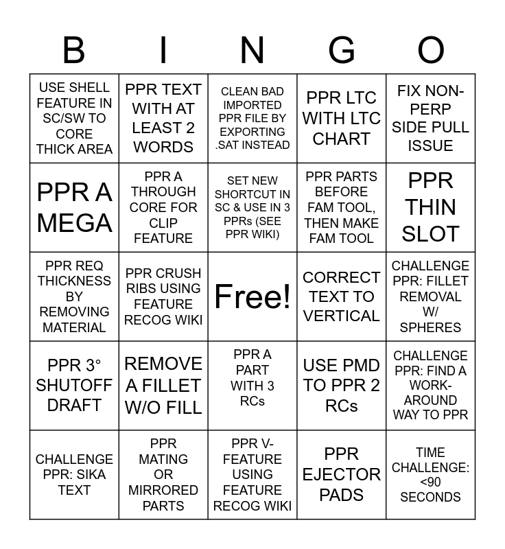 This bingo card has a free space and 24 words: REMOVE A FILLET W/O FILL, PPR MATING OR MIRRORED PARTS, SET NEW SHORTCUT IN SC & USE IN 3 PPRs (SEE PPR WIKI), CHALLENGE PPR: SIKA TEXT, FIX NON-PERP SIDE PULL ISSUE, USE SHELL FEATURE IN SC/SW TO CORE THICK AREA, PPR A MEGA, PPR TEXT WITH AT LEAST 2 WORDS, CORRECT TEXT TO VERTICAL, PPR A PART WITH 3 RCs, PPR PARTS BEFORE FAM TOOL, THEN MAKE FAM TOOL, PPR REQ THICKNESS BY REMOVING MATERIAL, USE PMD TO PPR 2 RCs, CHALLENGE PPR: FIND A WORK-AROUND WAY TO PPR, PPR A THROUGH CORE FOR CLIP FEATURE, PPR EJECTOR PADS, CHALLENGE PPR: FILLET REMOVAL W/ SPHERES, CLEAN BAD IMPORTED PPR FILE BY EXPORTING .SAT INSTEAD, PPR THIN SLOT, PPR CRUSH RIBS USING FEATURE RECOG WIKI, TIME CHALLENGE: <90 SECONDS, PPR 3° SHUTOFF DRAFT, PPR LTC WITH LTC CHART and PPR V-FEATURE USING FEATURE RECOG WIKI.