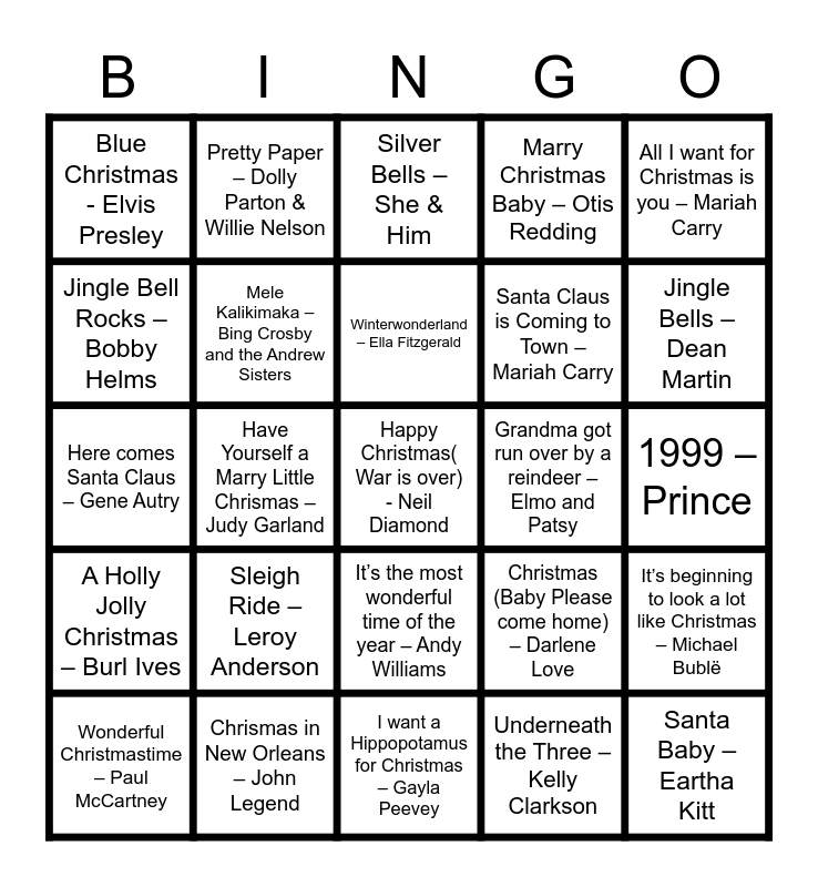 This bingo card has 67 words: Baby, It’s cold Outside – Idina Michael Buble, Hark! The Herald Angels sing _ Bad Religion, Happy New Year – Abba, It’s beginning to look a lot like Christmas – Michael Bublë, The Little Drummer Boy – Bing Crosby, Sleigh Ride - The Ronettes, Pretty Paper – Dolly Parton & Willie Nelson, Santa Claus is coming to town – Frank Sinatra, Winterwonderland – Ella Fitzgerald, Frosty the Snowman – Ella Fizgerald, It’s the most wonderful time of the year – Andy Williams, Driving Home For Christmas – Chris Rae, 1999 – Prince, All I want for Christmas is you – Mariah Carry, I saw mommy kissing Santa Claus – Jackson 5, Jingle Bell Rocks – Bobby Helms, Have Yourself a Marry Little Chrismas – Judy Garland, Blue Christmas - Elvis Presley, White Christmas – Bing Crostby, Santa Claus is Coming to Town – Mariah Carry, Sleigh Ride – Leroy Anderson, A Holly Jolly Christmas – Burl Ives, Marry Christmas Baby – Otis Redding, Underneath the Three – Kelly Clarkson, Marry Christmas and Happy Holidays - *NSYNC, Santa Tell Me – Ariane Grande, My only Wish (this year) – Britney Spears, I’ll be home for Christmas – Michael Buble, Jingle Bells – Dean Martin, Rockin’ Around the Christmas Tree – Brenda Lee, Happy Christmas( War is over) - Neil Diamond, Feliz Navidad – Jose Feliciano, I’d like you for Christmas – Julie London, This Christmas – Donny Hathaway, Run Rodolph Run – Chuck Berry, Wonderful Christmastime – Paul McCartney, This Christmas Song – Nat King Cole, Christmas (Baby Please come home) – Darlene Love, Here comes Santa Claus – Gene Autry, Santa Baby – Eartha Kitt, Rudolph The Red Nosed Reindeer – Dean Martin, Mele Kalikimaka – Bing Crosby and the Andrew Sisters, Grandma got run over by a reindeer – Elmo and Patsy, Twelve days of Christmas – John Denver and the Muppets, We wish you a Marry Christmas – John Denver and the Muppets, Sleigh Ride – Harry Connick JR, Belive- John Groban, Chrismas in New Orleans – John Legend, What Christmas means to me – Stevie Wonder, Mister Grinch – Allan Sherman, Silver Bells – She & Him, The Chipmunk Song – Alvin & the Chipmunks, The Christmas Waltz – Frank Sinatra, Fairytale of New York -The Pogues and Kristy MacColl, Up on the house Top – The Jackson 5, I want a Hippopotamus for Christmas – Gayla Peevey, The Merriest – June Christy, I wish it could be Christmas everyday – Wizzard, Please come home for Christmas – Eagles, Marry Christmas Darling – Carpenters, Do they know it is Christmas? Band Aid, Christmas Wrapping – Spice Girls, We need a Little Christmas – Angela Lansbury, The Chrismas Waltz – Peggy Lee, Let it Snow, Let it Snow, Let it Snow! - Harry Connick Jr, Rudoph the Red Nosed reindeer – Harry Connick JR and What are you doing new Year’s Eve? - Harry Connick JR.
