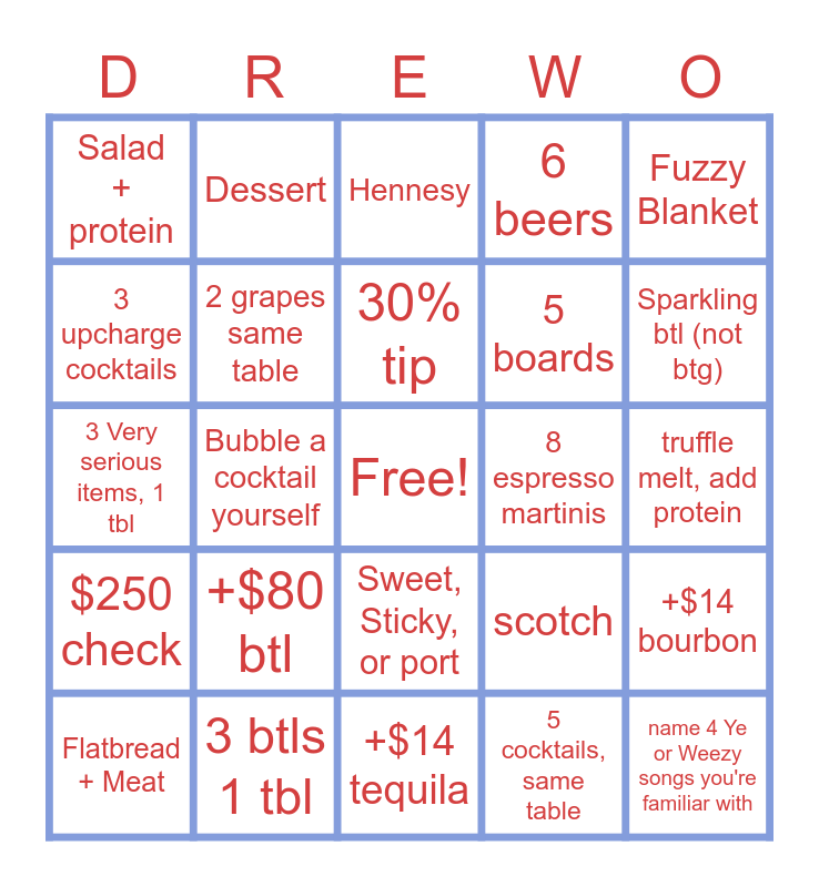 This bingo card has a free space and 24 words: +$80 btl, 3 btls 1 tbl, 30% tip, Flatbread + Meat, Fuzzy Blanket, Salad + protein, 3 upcharge cocktails, Dessert, 8 espresso martinis, Sweet, Sticky, or port, 5 boards, 3 Very serious items, 1 tbl, scotch, +$14 bourbon, 2 grapes same table, 5 cocktails, same table, truffle melt, add protein, Hennesy, Sparkling btl (not btg), Bubble a cocktail yourself, name 4 Ye or Weezy songs you're familiar with, $250 check, 6 beers and +$14 tequila.