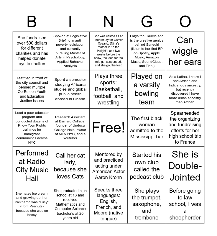 This bingo card has a free space and 26 words: Mentored by and practiced acting under American Actor Aaron Krohn, She plays the trumpet, saxophone, and trombone, Plays three sports: Basketball, football, and wrestling, She graduated high school at 16 and received Mathematics and Computer Science bachelor's at 20 years old, Can wiggle her ears, She fundraised over 500 dollars for different charities and has helped donate toys to shelters, Testified in front of the city council and penned multiple Op-Eds on Youth and Education Justice issues, Spoken at Legislative Briefing in anti-poverty legislation and currently pursuing Master of Arts in Psychology, Applied Behavior Analysis, Spearheaded the organizing and fundraising efforts for her high school trip to France, Started his own club called the podcast club, Played on a varsity bowling team, Lead a peer educator program and conducted dozens of Know Your Rights trainings for immigrant communities across NYC, She is Double-Jointed, She hates ice cream, and growing up, her nickname was "Lucy" (from Peanuts) because she was so bossy, Research Assistant at Barnard College, founder of Undocu College Help, owner of MLN NYC, and a Youtuber, An operational specialist at Apple and an RA at purchase college, Plays the ukulele and is the creative genius behind Sanegirl (listen to her first EP on Spotify, Apple Music, Amazon Music, SoundCloud, and Tidal), Performed at Radio City Music Hall, She was casted as an understudy for Camila Rosario, (Nina's mother in 'In the Height'), and two weeks before the show, the lead for the role got suspended, and she got the lead, Before going to law school, I was a sheepherder, As a Latina, I knew I had African and Indigenous ancestry, but recently discovered I have more Asian ancestry than African, Speaks three languages: English, French, and Moore (native tongue), The first black woman admitted to the Mississippi bar, Call her cat lady, because she loves Cats, Spent a semester studying Africana studies and global public health abroad in Ghana and I am a General Attorney at U.S. Securities and Exchange Commission.