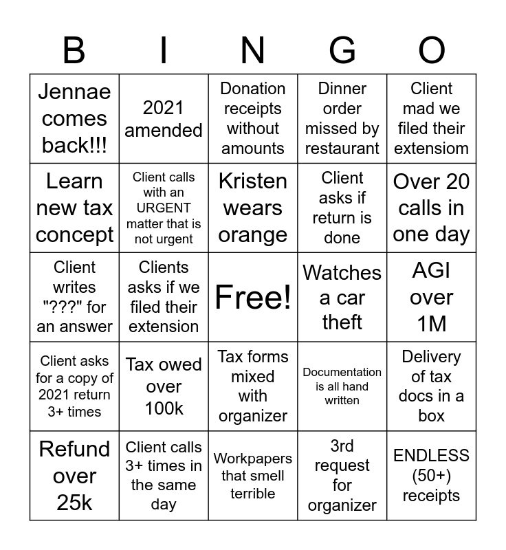 This bingo card has a free space and 42 words: Ryan wears pink, Kristen wears orange, Catch Coleman at his desk, Tax owed over 100k, 3rd request for organizer, Delivery of tax docs in a box, ENDLESS (50+) receipts, Tax Forms stapled to organizer page, Donation receipts without amounts, Tax forms mixed with organizer, AGI over 1M, Over 20 calls in one day, Clients asks if we filed their extension, Client mad we filed their extensiom, Client tries to take an animal as an expense, Documentation is all hand written, Received signed Engagement letter, Client writes "???" for an answer, Rerun in the same day, 2021 amended, Learn new tax concept, Angry phone call, Blank organizer returned, Jennae comes back!!!, You tell the joke at the Stand Up Meeting, Client tells you why they had medical expenses, Client asks if return is done, WPS provided after April 10th and wants it done by deadline, 20+ 8879s received in 1 day, Someone tells you "I need coffee", Explains refund/amount owed to a client more than once in the same week, Client asks for a copy of 2021 return 3+ times, Client calls with an URGENT matter that is not urgent, Workpapers that smell terrible, Coffee spilled on workpapers, Refund over 25k, Client calls 3+ times in the same day, Watches a car theft, Car accident on 1st & Washington, Snows 3+ Inches, Dinner order missed by restaurant and Server down for over 1 hour.