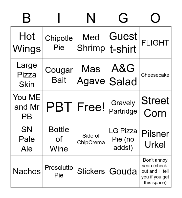 This bingo card has a free space and 24 words: Bottle of Wine, Prosciutto Pie, Mas Agave, Nachos, FLIGHT, Hot Wings, Large Pizza Skin, Chipotle Pie, Gravely Partridge, Side of ChipCrema, A&G Salad, You ME and Mr PB, LG Pizza Pie (no adds!), Pilsner Urkel, Cougar Bait, Gouda, Street Corn, Med Shrimp, Cheesecake, PBT, Don't annoy sean (check-out and ill tell you if you get this space), SN Pale Ale, Guest t-shirt and Stickers.