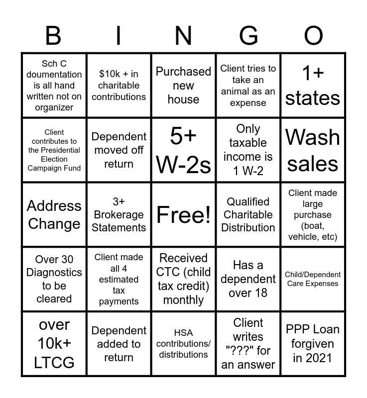 This bingo card has a free space and 40 words: 4 Dependents, Address Change, Name Change, Dependent moved off return, Dependent added to return, Received CTC (child tax credit) monthly, 5+ W-2s, W-2, Dividends, Interest + Cap Gain gain /loss income, 1+ states, Over 30 Diagnostics to be cleared, 3+ Brokerage Statements, Client tries to take an animal as an expense, PPP Loan forgiven in 2021, Client made large purchase (boat, vehicle, etc), Qualified Charitable Distribution, Client made all 4 estimated tax payments, 1099-G (Unelpoyment), Sch C doumentation is all hand written not on organizer, Refinanced House, Purchased new house, Child/Dependent Care Expenses, Client writes "???" for an answer, Only taxable income is 1 W-2, Client contributes to the Presidential Election Campaign Fund, Changes occupation, Changes banks direct deposit info, Schedule A utilized, You tell the joke at the Stand Up Meeting, Client Over 90 Years Old, K-1 in WPS, Sch C, over 10k+ LTCG, Included tax forms for children, Has a dependent over 18, Wash sales, HSA contributions/ distributions, 1098-E, 1098-T, $10k + in charitable contributions and Sch E.