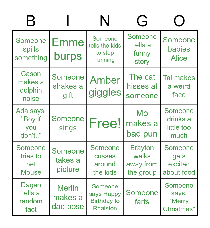 This bingo card has a free space and 24 words: Someone takes a picture, Merlin makes a dad pose, Amber giggles, Dagan tells a random fact, Someone babies Alice, Someone spills something, Cason makes a dolphin noise, Emme burps, Mo makes a bad pun, Someone cusses around the kids, The cat hisses at someone, Ada says, "Boy if you don't..", Brayton walks away from the group, Someone gets excited about food, Someone shakes a gift, Someone farts, Someone drinks a little too much, Someone tells the kids to stop running, Tal makes a weird face, Someone sings, Someone says, "Merry Christmas", Someone tries to pet Mouse, Someone tells a funny story and Someone says Happy Birthday to Rhalston.