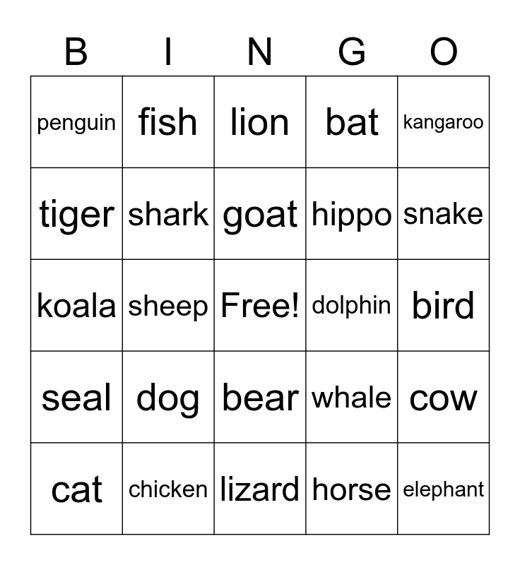 This bingo card has a free space and 24 words: dog, chicken, goat, cat, kangaroo, penguin, tiger, fish, dolphin, bear, hippo, koala, whale, cow, shark, horse, bird, lion, snake, sheep, elephant, seal, bat and lizard.