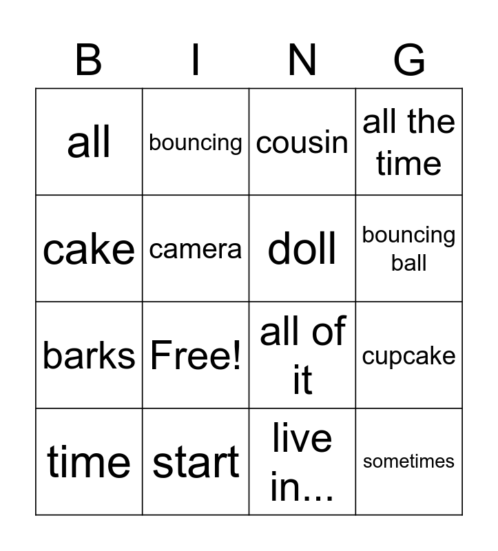 This bingo card has 18 words: Free!, sometimes, cousin, all, all of it, all the time, time, bouncing, bouncing ball, barks, live in..., cake, cupcake, camera, doll, rip off, start and start with ....