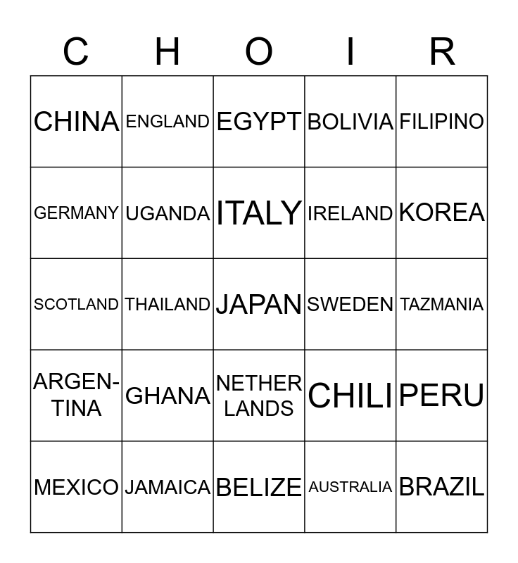 This bingo card has a free space and 24 words: GHANA, JAMAICA, ITALY, MEXICO, FILIPINO, CHINA, GERMANY, ENGLAND, SWEDEN, NETHER LANDS, IRELAND, SCOTLAND, CHILI, PERU, UGANDA, AUSTRALIA, TAZMANIA, EGYPT, KOREA, THAILAND, BRAZIL, ARGEN- TINA, BOLIVIA and BELIZE.