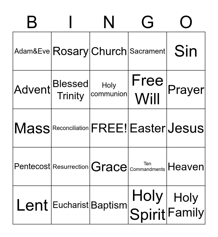 This bingo card has a free space and 24 words: Resurrection, Eucharist, Holy communion, Lent, Sin, Adam&Eve, Advent, Rosary, Easter, Grace, Free Will, Mass, Ten Commandments, Heaven, Blessed Trinity, Holy Spirit, Jesus, Church, Prayer, Reconciliation, Holy Family, Pentecost, Sacrament and Baptism.