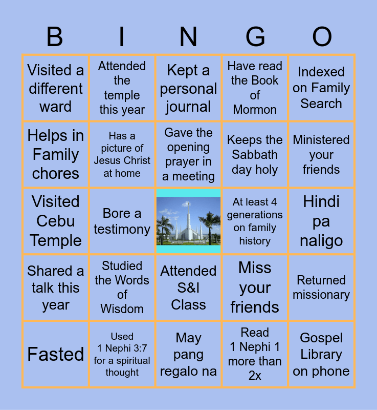 This bingo card has a free space and 32 words: Read 1 Nephi 1 more than 2x, Slept through a church meeting, Bore a testimony, Baptized, Shared a talk this year, Has a picture of Jesus Christ at home, Indexed on Family Search, Returned missionary, Attended the temple this year, Ward/ Stake calling, Gave the opening prayer in a meeting, Kept a personal journal, Listened in general conference, Prayed this morning, At least 4 generations on family history, Reccomended a friend to the missionaries, Fasted, Visited Cebu Temple, Attended S&I Class, Studied the Words of Wisdom, Miss your friends, Suki ng Shopee at Lazada, Hindi pa naligo, Used 1 Nephi 3:7 for a spiritual thought, Gospel Library on phone, Have read the Book of Mormon, Keeps the Sabbath day holy, Helps in Family chores, Visited a different ward, May pang regalo na, Shared an uplifting post online and Ministered your friends.