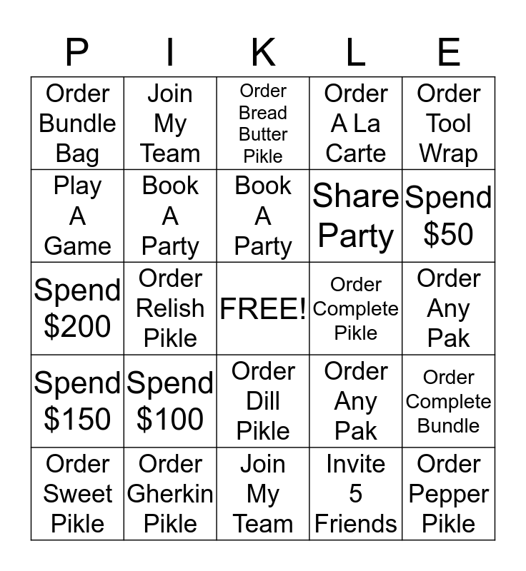 This bingo card has a free space and 24 words: Spend $100, Order Gherkin Pikle, Book A Party, Order Sweet Pikle, Order Tool Wrap, Order Bundle Bag, Play A Game, Join My Team, Order Complete Pikle, Order Dill Pikle, Share Party, Spend $200, Order Any Pak, Order Complete Bundle, Book A Party, Invite 5 Friends, Order Any Pak, Order Bread Butter Pikle, Spend $50, Order Relish Pikle, Order Pepper Pikle, Spend $150, Order A La Carte and Join My Team.