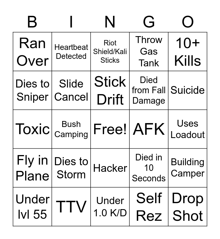 This bingo card has a free space and 24 words: Dies to Storm, TTV, Stick Drift, Under lvl 55, 10+ Kills, Ran Over, Dies to Sniper, Heartbeat Detected, AFK, Hacker, Died from Fall Damage, Toxic, Died in 10 Seconds, Building Camper, Slide Cancel, Self Rez, Uses Loadout, Riot Shield/Kali Sticks, Suicide, Bush Camping, Drop Shot, Fly in Plane, Throw Gas Tank and Under 1.0 K/D.