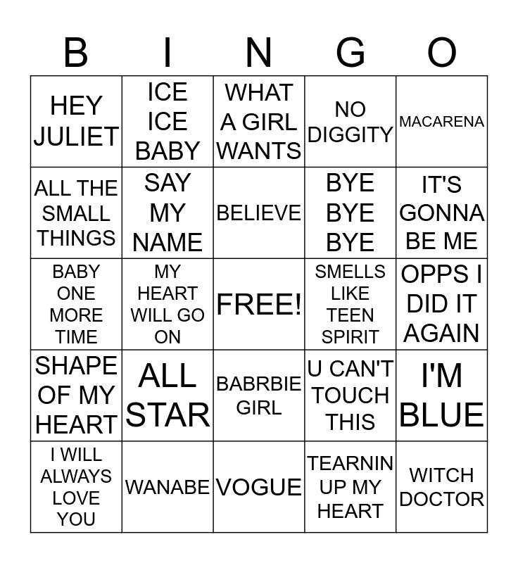 This bingo card has a free space and 24 words: ALL STAR, WANABE, BELIEVE, I WILL ALWAYS LOVE YOU, MACARENA, HEY JULIET, ALL THE SMALL THINGS, ICE ICE BABY, SMELLS LIKE TEEN SPIRIT, BABRBIE GIRL, BYE BYE BYE, BABY ONE MORE TIME, U CAN'T TOUCH THIS, I'M BLUE, SAY MY NAME, TEARNIN UP MY HEART, OPPS I DID IT AGAIN, WHAT A GIRL WANTS, IT'S GONNA BE ME, MY HEART WILL GO ON, WITCH DOCTOR, SHAPE OF MY HEART, NO DIGGITY and VOGUE.