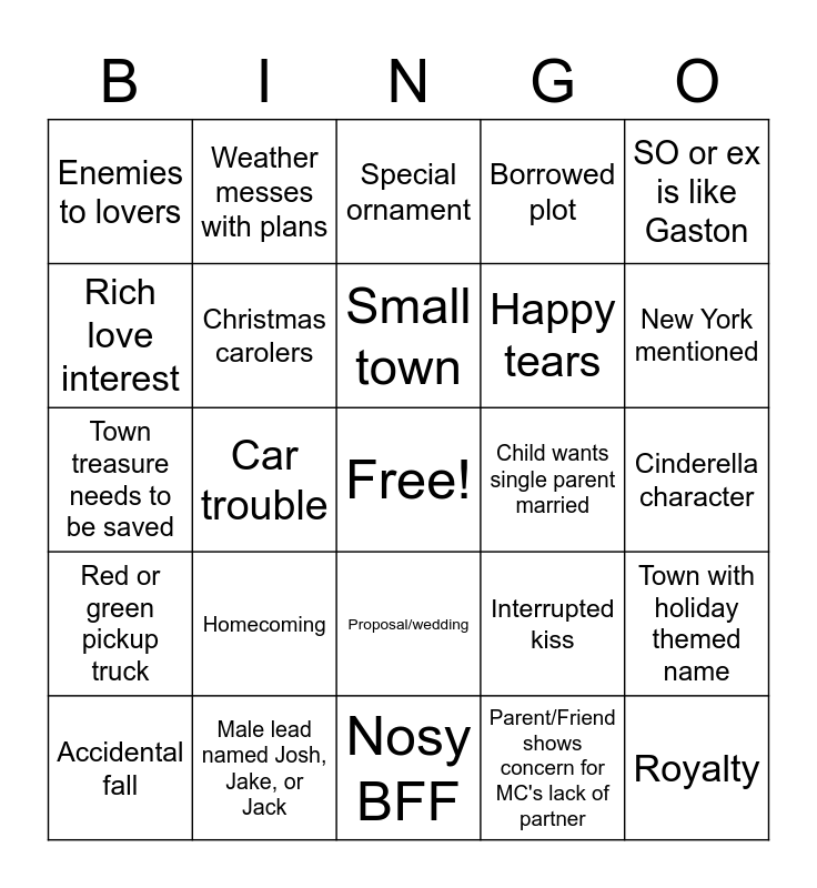 This bingo card has a free space and 78 words: Multihunk (3+ hot guys), Baking, Special ornament, Ice skating, Specific family tradition, Person with holiday themed name, Visiting orphanage or nursing home, Santa Claus Guy, Modern version of Christmas song, Businessman/Businesswoman, Single parent, Mistletoe, Borrowed plot, Enemies to lovers, Used to love Christmas, now hates it, Rich love interest, Scrooge/Grinch character, Homecoming, Fake relationship/fake identity, Cinderella character, Sleigh ride, SO or ex is like Gaston, Town treasure needs to be saved, Small town, Christmas carolers, Hot cocoa, MC can't stay in town long, Airport scene, Sherrif, Dr., Mayor, Policeman, Priest appearance, Couple see eachother dressed up, New York mentioned, Christmas sweaters, Nosy BFF, Christmas party/festival, Accidental fall, Child wants single parent married, Christmas wish, Sworn off love, Montage, Royalty, Red dress, Big city boyfriend/ex shows up, Love triangle, Gifting jewelry, Christmas play, Weather messes with plans, Snowball fight, Make snowman, Learns to believe, Decorating tree/house, Town with holiday themed name, Car trouble, Interrupted kiss, Adult-like child, In need of miracle, Running after love interest, Talking about dead person, Christmas shopping, Multigenerational family gathering, Proposal/wedding, Happy tears, Town stroll, Title has Christmas in it, Breaking off engagement, Christmas Eve/Day deadline, Shirtless guy, Event no one will go to, everyone goes to, Breakup scene, Red or green pickup truck, Male lead named Josh, Jake, or Jack, Inheritance, Old letters, Ethnically diverse BFF, Sip empty coffee cup, Parent/Friend shows concern for MC's lack of partner, Close contact activity, Withholds secret and Heart-to-heart.