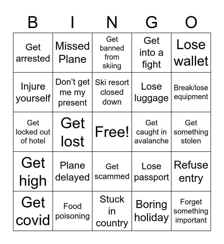 This bingo card has a free space and 25 words: Plane delayed, Stuck in country, Ski resort closed down, Get covid, Lose wallet, Get arrested, Injure yourself, Missed Plane, Get caught in avalanche, Get scammed, Lose luggage, Get locked out of hotel, Lose passport, Refuse entry, Don’t get me my present, Run out of money, Get something stolen, Get banned from skiing, Break/lose equipment, Get lost, Forget something important, Food poisoning, Get high, Get into a fight and Boring holiday.