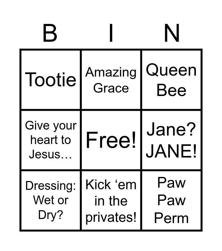 This bingo card has a free space and 8 words: Jane? JANE!, Queen Bee, Amazing Grace, Dressing: Wet or Dry?, Tootie, Paw Paw Perm, Give your heart to Jesus… and Kick ‘em in the privates!.