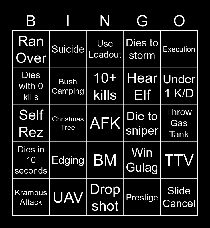 This bingo card has 25 words: Edging, Drop shot, 10+ kills, Krampus Attack, Execution, Ran Over, Dies with 0 kills, Suicide, Die to sniper, BM, Hear Elf, Self Rez, Win Gulag, TTV, Bush Camping, Slide Cancel, Throw Gas Tank, Use Loadout, Under 1 K/D, Christmas Tree, AFK, UAV, Dies in 10 seconds, Dies to storm and Prestige.