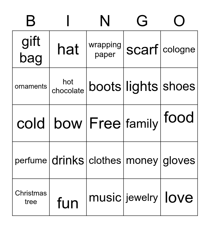 This bingo card has a free space and 29 words: Christmas tree, presents, bow, ribbon, gift bag, wrapping paper, hot chocolate, drinks, family, fun, food, love, music, jewelry, shoes, toys, clothes, perfume, cologne, cold, money, candle, lights, ornaments, scarf, hat, gloves, boots and make-up.