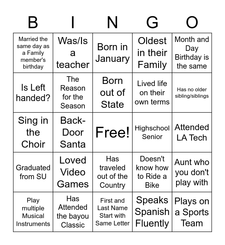 This bingo card has a free space and 24 words: Loved Video Games, Has Attended the bayou Classic, Born out of State, Play multiple Musical Instruments, Month and Day Birthday is the same, Married the same day as a Family member's birthday, Is Left handed?, Was/Is a teacher, Highschool Senior, Has traveled out of the Country, Lived life on their own terms, Sing in the Choir, Doesn't know how to Ride a Bike, Aunt who you don't play with, The Reason for the Season, Speaks Spanish Fluently, Attended LA Tech, Born in January, Has no older sibling/siblings, Back-Door Santa, Plays on a Sports Team, Graduated from SU, Oldest in their Family and First and Last Name Start with Same Letter.