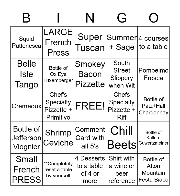This bingo card has a free space and 24 words: Shrimp Ceviche, **Completely reset a table by yourself, Smokey Bacon Pizzette, Small French PRESS, 4 courses to a table, Squid Puttenesca, Belle Isle Tango, LARGE French Press, Chefs Specialty Pizzette + Riff, Comment Card with all 5's, South Street Slippery when Wit, Cremeoux, Chill Beets, Bottle of Kaltern Guwertzmeiner, Bottle of Ox Eye Luxemberger, Shirt with a wine or beer reference, Bottle of Patz+Hall Chardonnay, Super Tuscan, Pompelmo Fresca, Chef's Specialty Pizzette + Primitivo, Bottle of Afton Mountain Festa Biaco, Bottle of Jefferson Viognier, Summer + Sage and 4 Desserts to a table of 4 or more.
