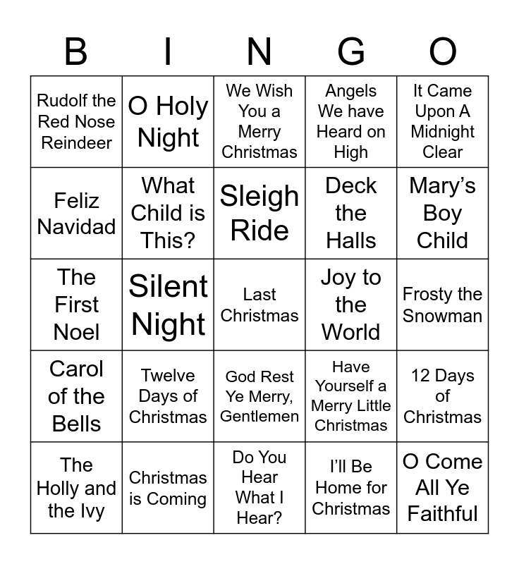 This bingo card has 35 words: All I want for Christmas is You, It’s Beginning to Look a Lot like Christmas, Silver Bells, What Child is This?, God Rest Ye Merry, Gentlemen, Angels We have Heard on High, Feliz Navidad, It’s the Most Wonderful Time of the Year, Sleigh Ride, Jingle Bell Rock, The First Noel, It Came Upon A Midnight Clear, Hark the Herald Angels Sing, Blue Christmas, Rudolf the Red Nose Reindeer, Joy to the World, I’ll Be Home for Christmas, Silent Night, Carol of the Bells, Last Christmas, Have Yourself a Merry Little Christmas, The Holly and the Ivy, 12 Days of Christmas, Christmas is Coming, We Wish You a Merry Christmas, Mary’s Boy Child, O Come All Ye Faithful, Here Comes Santa Clause, Deck the Halls, Frosty the Snowman, O Christmas Tree, Do You Hear What I Hear?, Twelve Days of Christmas, O Holy Night and Silent Night.