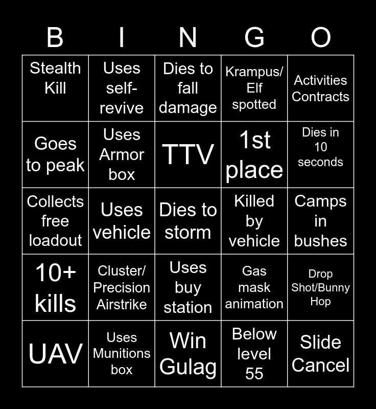 This bingo card has 25 words: 10+ kills, Uses Munitions box, Dies to storm, Below level 55, Activities Contracts, Stealth Kill, Uses self-revive, Dies to fall damage, Killed by vehicle, Drop Shot/Bunny Hop, Goes to peak, Uses Armor box, Win Gulag, Gas mask animation, Dies in 10 seconds, UAV, Uses vehicle, TTV, 1st place, Camps in bushes, Collects free loadout, Cluster/ Precision Airstrike, Uses buy station, Krampus/ Elf spotted and Slide Cancel.