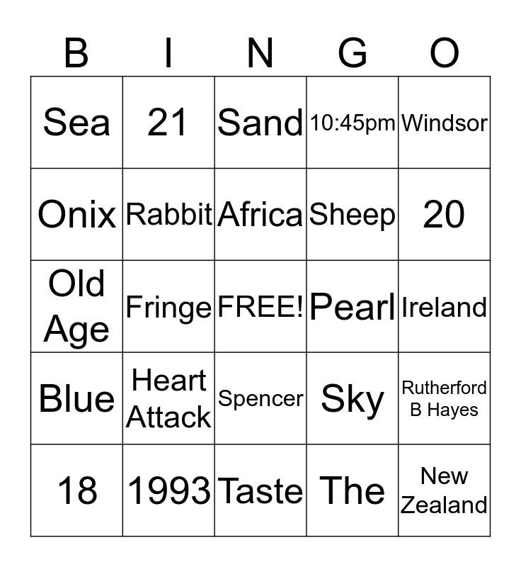 This bingo card has a free space and 24 words: Heart Attack, 1993, Africa, 18, Windsor, Sea, Onix, 21, Pearl, Spencer, Sheep, Old Age, Sky, Rutherford B Hayes, Rabbit, The, Ireland, Sand, 20, Fringe, New Zealand, Blue, 10:45pm and Taste.