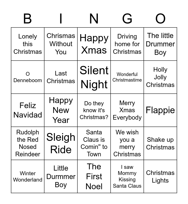 This bingo card has 41 words: All I want for Christmas is you, Feliz Navidad, Jingle Bell Rock, Last Christmas, Little Durmmer Boy, Santa Claus is Comin'' to Town, Silent Night, Thank God it's Christmas, The little Drummer Boy, Rudolph the Red Nosed Reindeer, Happy New Year, Driving home for Christmas, Do they know it's Christmas?, Flappie, Merry Xmas Everybody, Sleigh Ride, Here Comes Santa Claus, Lonely this Christmas, Let it Snow, Happy Xmas, Shake up Christmas, Christmas Lights, The First Noel, Wonderful Christmastime, Mary, did you know?, Carol of the Bells, I saw Mommy Kissing Santa Claus, Wishes Come true, Holly Jolly Christmas, Cuddle Up, Cozy Down Christmas, Once upon a Christmas, Chrismas Without You, Winter Wonderland, Mary's boy child, We wish you a merry Christmas, O Denneboom, Have Yourself a Merry little Christmas, Ik ben een kerstbal, Niemand mag alleen zijn, Beuk de Ballen Uit de boom and Niets is cooler dan Kerstmis.