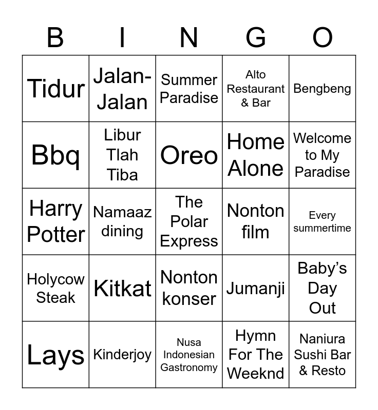 This bingo card has a free space and 24 words: Kitkat, Kinderjoy, Oreo, Lays, Bengbeng, Tidur, Bbq, Jalan-Jalan, Nonton film, Nonton konser, Home Alone, Harry Potter, Jumanji, Baby’s Day Out, Libur Tlah Tiba, Hymn For The Weeknd, Every summertime, Summer Paradise, Welcome to My Paradise, Namaaz dining, Naniura Sushi Bar & Resto, Holycow Steak, Alto Restaurant & Bar and Nusa Indonesian Gastronomy.