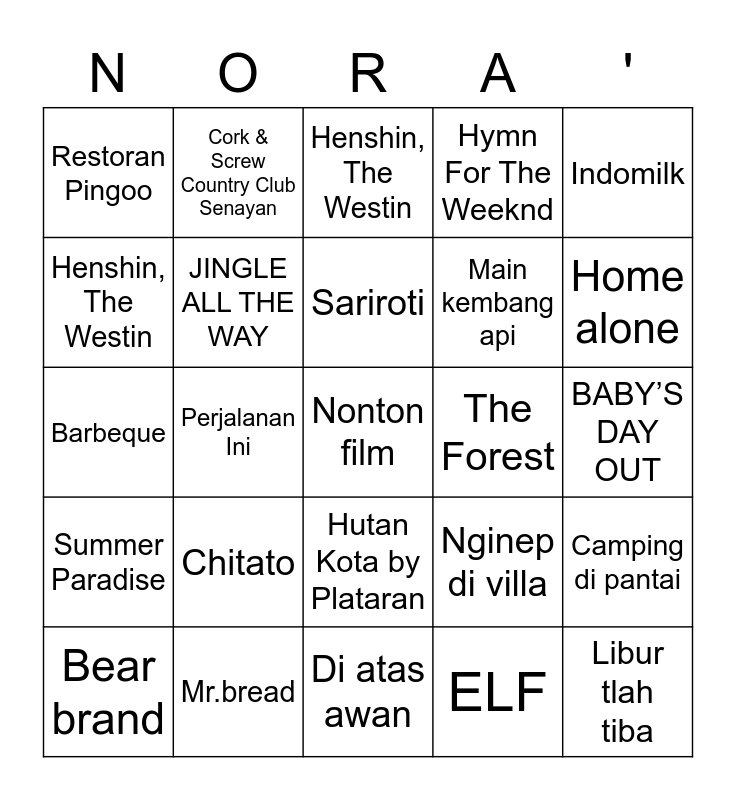 This bingo card has a free space and 24 words: Chitato, Mr.bread, Sariroti, Bear brand, Indomilk, Restoran Pingoo, Henshin, The Westin, Cork & Screw Country Club Senayan, The Forest, Hutan Kota by Plataran, Main kembang api, Barbeque, Nginep di villa, Camping di pantai, JINGLE ALL THE WAY, ELF, BABY’S DAY OUT, Henshin, The Westin, Home alone, Perjalanan Ini, Libur tlah tiba, Summer Paradise, Hymn For The Weeknd and Di atas awan.