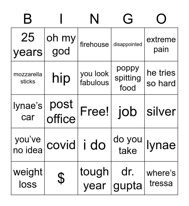 This bingo card has a free space and 34 words: kidney, dr. gupta, sambuca, vows, you’ve no idea, hip, extreme pain, weight loss, oh my god, i had no idea, you look fabulous, firehouse, disney, the voice, job, he tries so hard, $, lynae’s car, covid, do you take, i do, ethan allen, 25 years, silver, tough year, where’s tressa, disappointed, gotta go, poppy spitting food, mozzarella sticks, firefighter, post office, lynae and lobster tails.