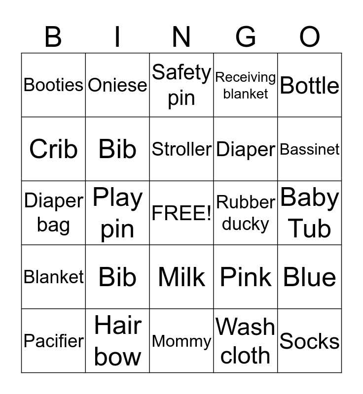 This bingo card has a free space and 24 words: Bib, Hair bow, Stroller, Pacifier, Bottle, Booties, Crib, Oniese, Rubber ducky, Milk, Diaper, Diaper bag, Pink, Blue, Bib, Wash cloth, Baby Tub, Safety pin, Bassinet, Play pin, Socks, Blanket, Receiving blanket and Mommy.