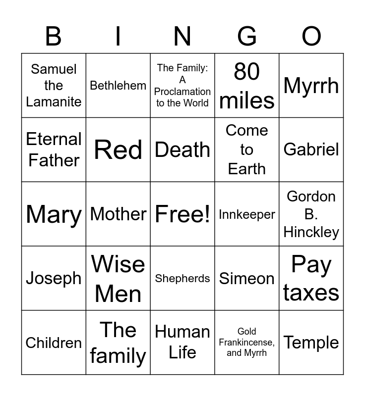 This bingo card has a free space and 29 words: Children, Father, Mother, 1995, Samuel the Lamanite, The Family: A Proclamation to the World, Red, Wise Men, Innkeeper, The family, Gordon B. Hinckley, Temple, Human Life, Gold Frankincense, and Myrrh, Gabriel, Carpenter, Shepherds, Joseph, Myrrh, Mary, Simeon, Extended Family, Come to Earth, Eternal Father, 80 miles, Bethlehem, Pay taxes, Death and A feeding trough.