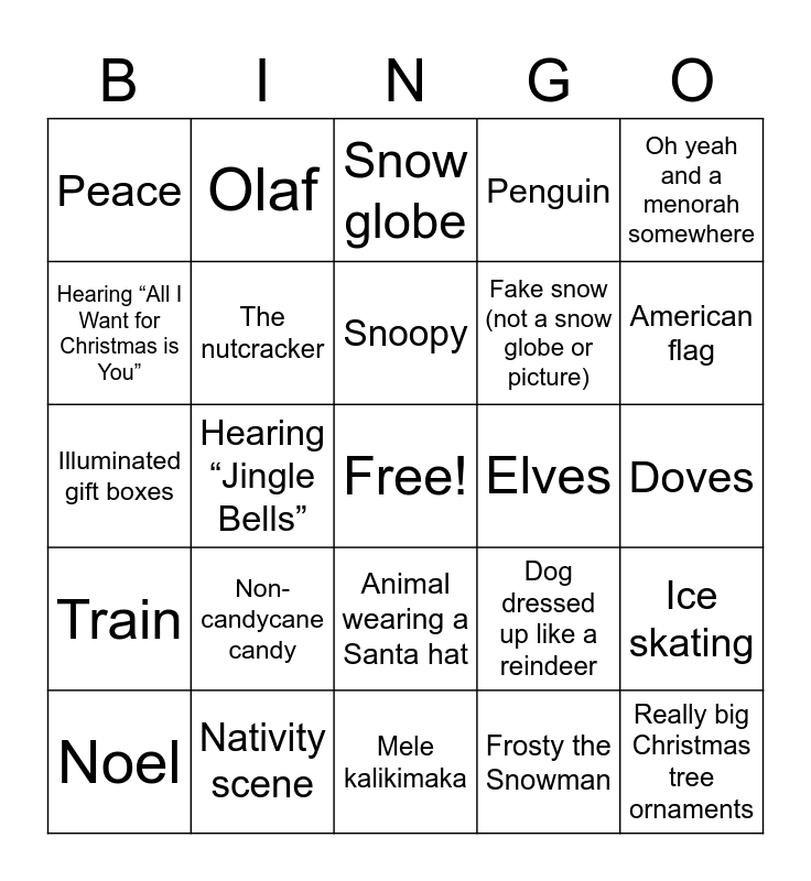 This bingo card has a free space and 33 words: Animatronic Santa, Mrs. Claus, Hearing “Jingle Bells”, Mistletoe, Train, The nutcracker, Oh yeah and a menorah somewhere, Noel, Olaf, Rudolph with a lit up nose, Snoopy, Snow globe, Jesus, Santa in a car or truck, Elves, American flag, Nativity scene, Illuminated gift boxes, Non-candycane candy, Dog dressed up like a reindeer, Animal wearing a Santa hat, More than 10 candy canes in a display, Peace, Doves, Mele kalikimaka, Really big Christmas tree ornaments, Penguin, Fake snow (not a snow globe or picture), Hearing “All I Want for Christmas is You”, Ice skating, Candles, Frosty the Snowman and Sign welcoming you to the North Pole.