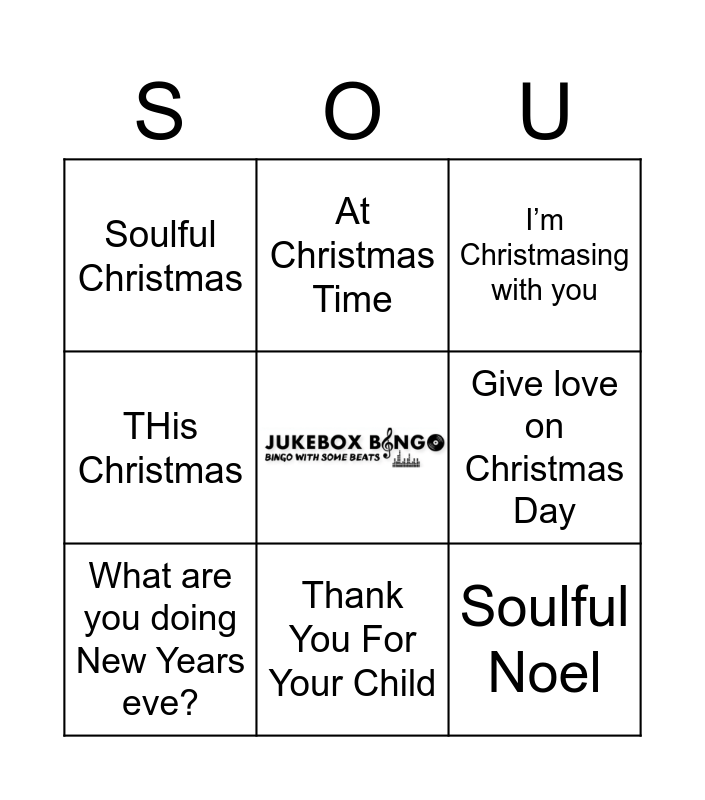 This bingo card has a free space and 30 words: Why do The Nations so furiously rage?, Let us adore Him, Have yourself a Merry little Christmas, We three Kings, Soulful Christmas, I’m Christmasing with you, What are you doing New Years eve?, Christmas (Baby Please Come home), Soul Holidays, Hold on, Help is on the way, Who would imagine a King, Merry Christmas baby, Carol of the bells, The mistletoe Jam, Silver and Gold, The greatest gift of all, O Holy Night, It’s Christmas, Tis the Season, Soulful Noel, Happy Holidays to you, Let it snow, At Christmas Time, I saw mommy kissing Santa Claus, Give love on Christmas Day, THis Christmas, Me & Mrs Claus, Silent Night, Thank You For Your Child and O come all Ye Faithful.