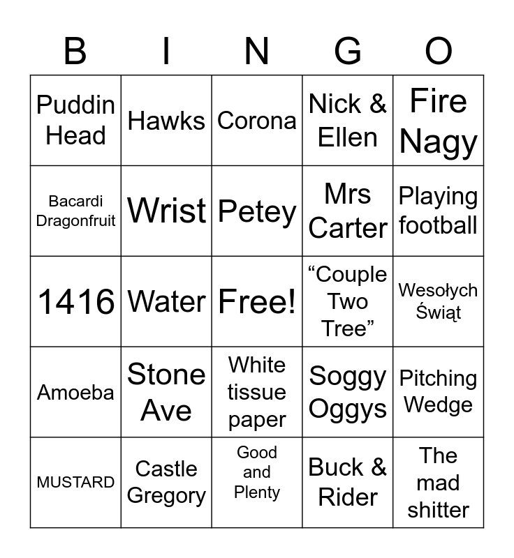 This bingo card has a free space and 55 words: Pickle, MUSTARD, Fondue, Puddin Head, Good and Plenty, July 31 2021, Wrist, Sicily, Mrs Carter, Cabo, Nick & Ellen, Park, Chicago Style Smiles, Delta Tau Delta, Ghost in the graveyard, Music, Fire Nagy, Water, Ryan Silver, The mad shitter, “Couple Two Tree”, Mini Golden doodle, Soggy Oggys, Corona, Jason, Petey, Buck & Rider, July 1 2021, Wesołych Świąt, Pitching Wedge, Ain’t No Mountain High, Cardinals, The elm, Gavin, Bacardi Dragonfruit, 1416, Hot peanuts, Amoeba, A puppy, Pattys Pups, Hawks, The lumina, *NSYNC, It gets dead, Stone Ave, Castle Gregory, Peter Letarte, Percussion, Flute, Playing football, SUADs, Grandma Lipuma, Hinsdale Golf Club, White tissue paper and Hot Cross Buns.